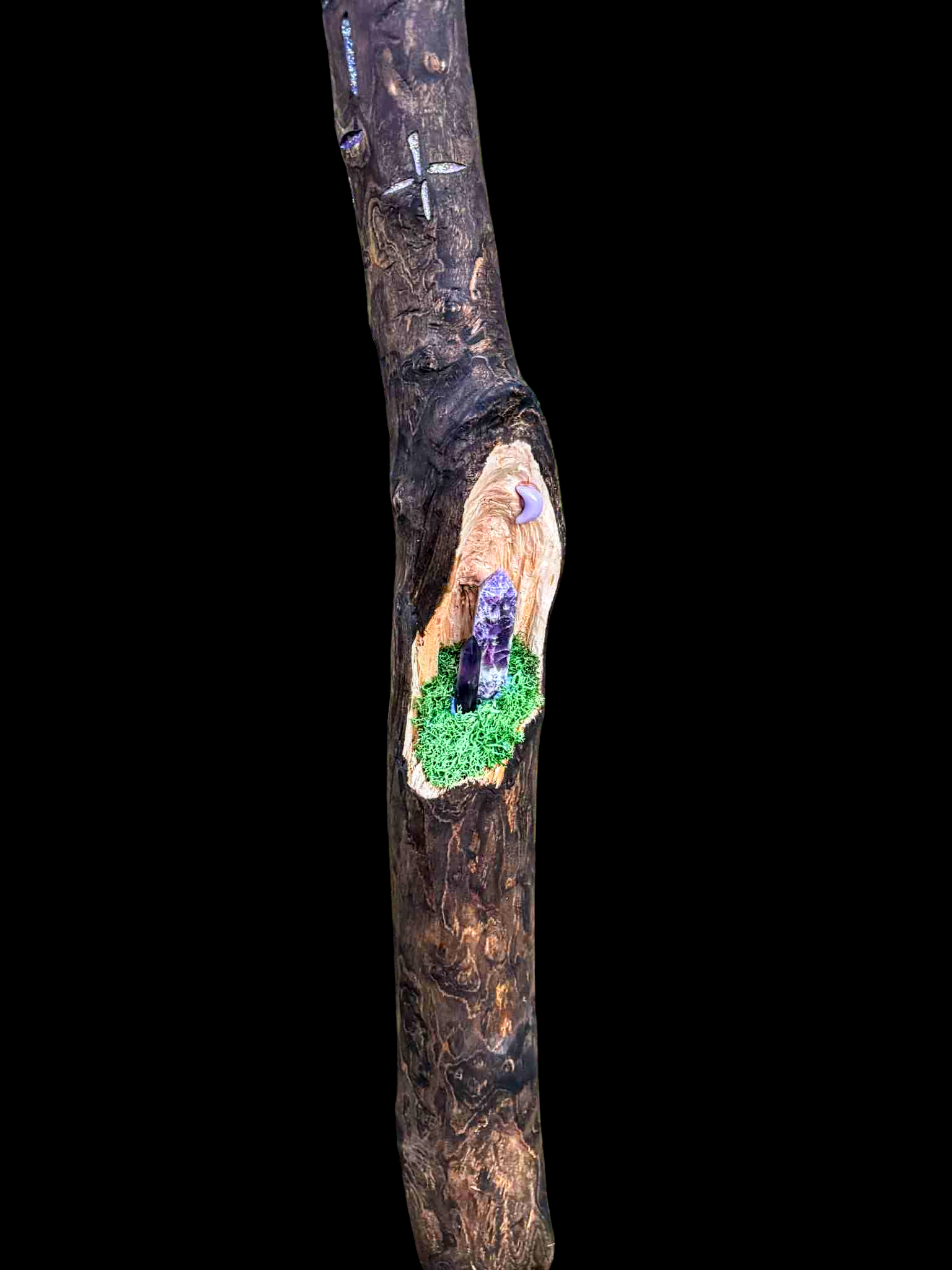 The Thick Columbian Oak, provids stability and grounding strength. It is crowned by the Purple Sodalite Spear Tip for focus and clarity, and empowered by dual Amethyst and Plum Tourmaline Towers for balance.